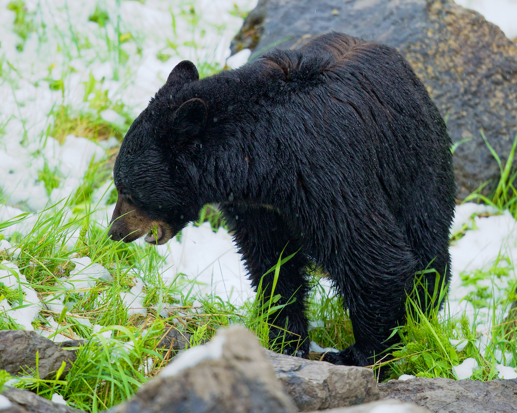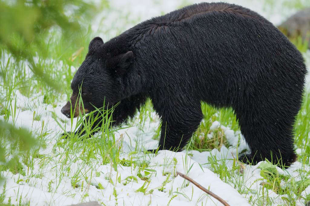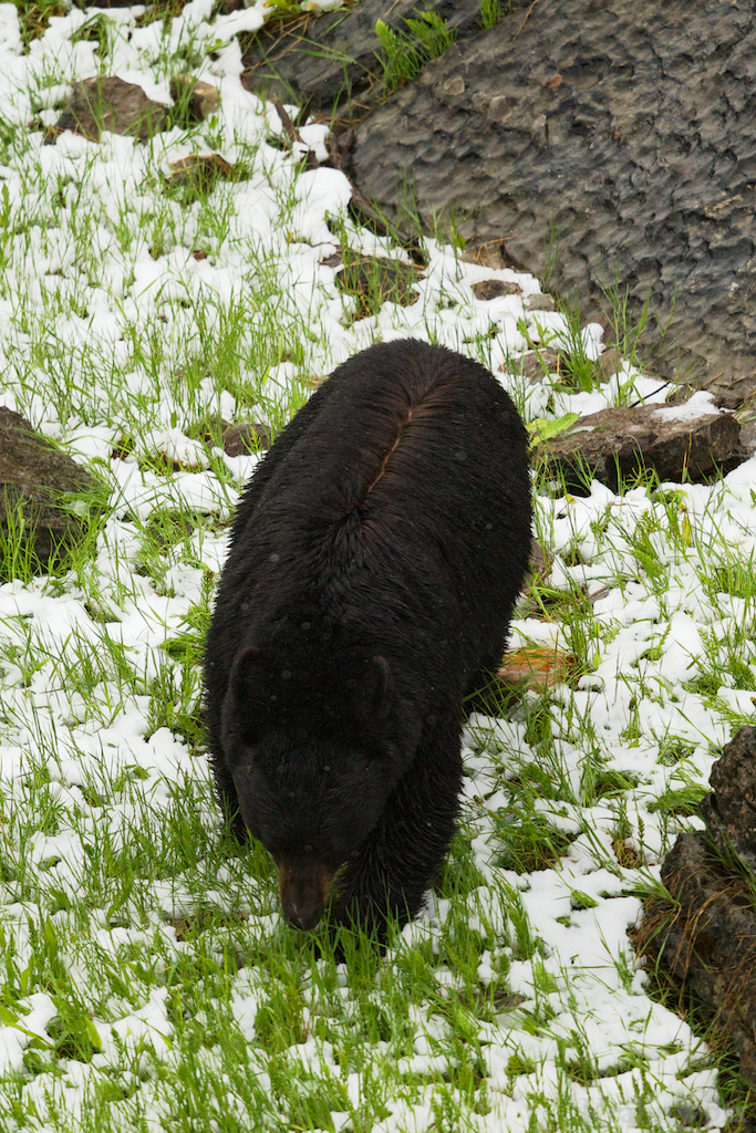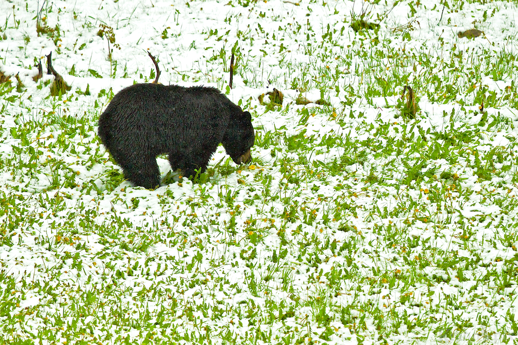 One of the keys to finding bears is putting in the time according to one of the locals. So the next day we returned to the same location but it was dramatically different. There was snow on the ground, snow floating through the air and, most importantly, a bear munching on dandelions. This was much better.