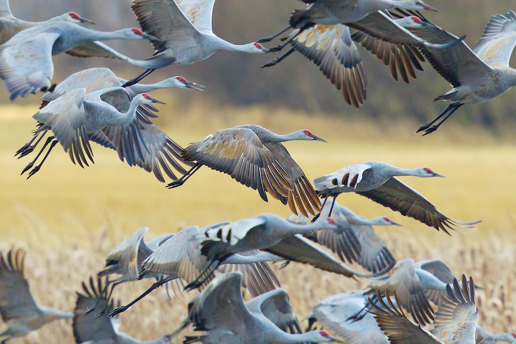 The photo below tries to get the best of both worlds. By highlighting one sandhill crane in a crowd it somehow seemed OK to crop off a few body parts on the edges since it adds to the feeling of flying in close quarters. What do you think?