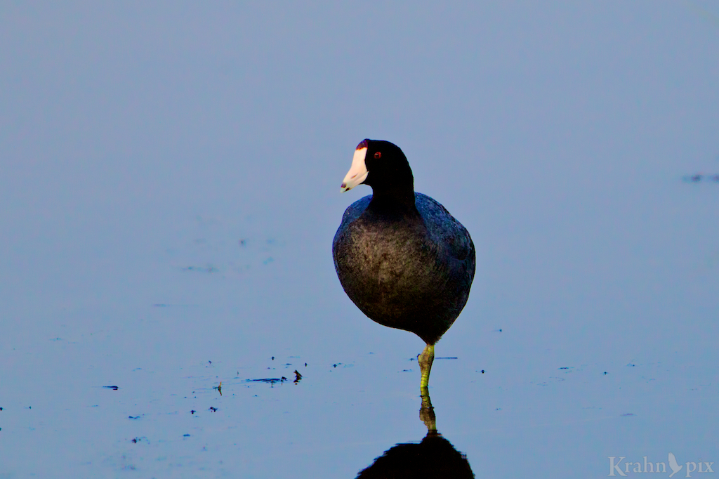 A Coot, of all birds to photograph in a one-legged stance! Now there’s a trend-setting species, not a follower! Coots probably started the whole one-legged thing. 🙂