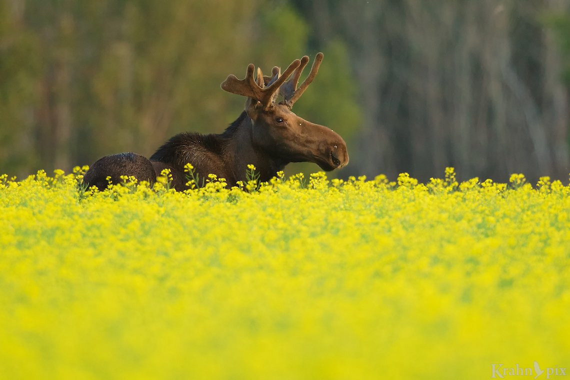 I must not forget to thank the farmer who carefully planted the foreground … err canola and fertilized it so it would provide such a wonderful setting for the moose. He appears to be almost swimming in the sea of flowering canola. The truth is he’s clomping through it with those giant hooves, knocking down stalks while grazing away. Maybe I won’t bother to thank the farmer. Chances are he might prefer to harvest it himself.